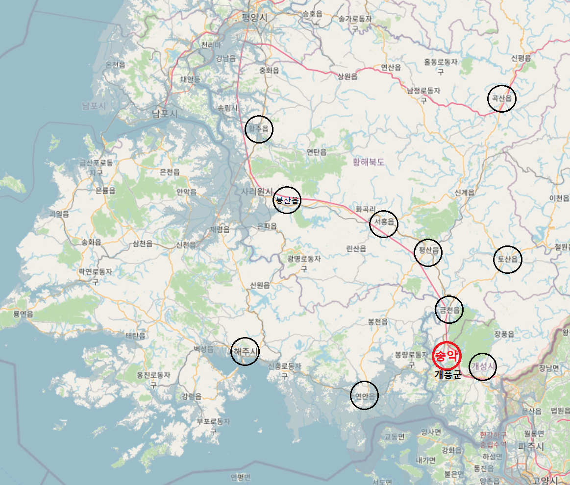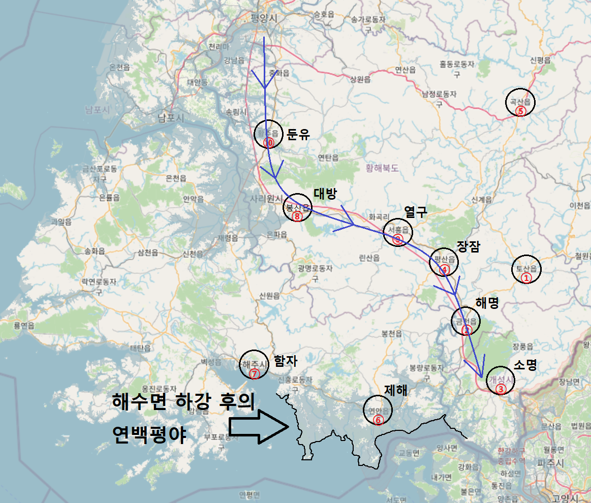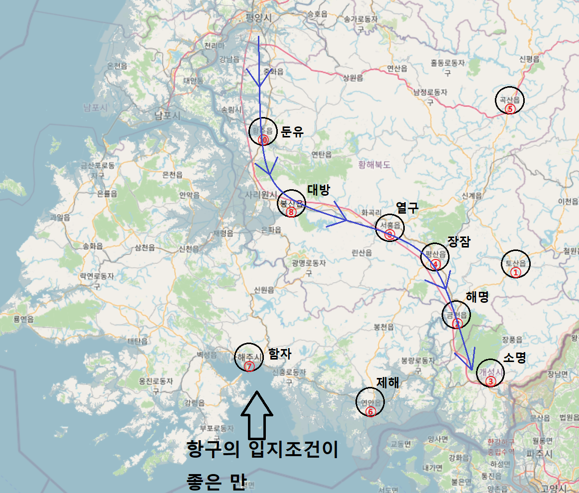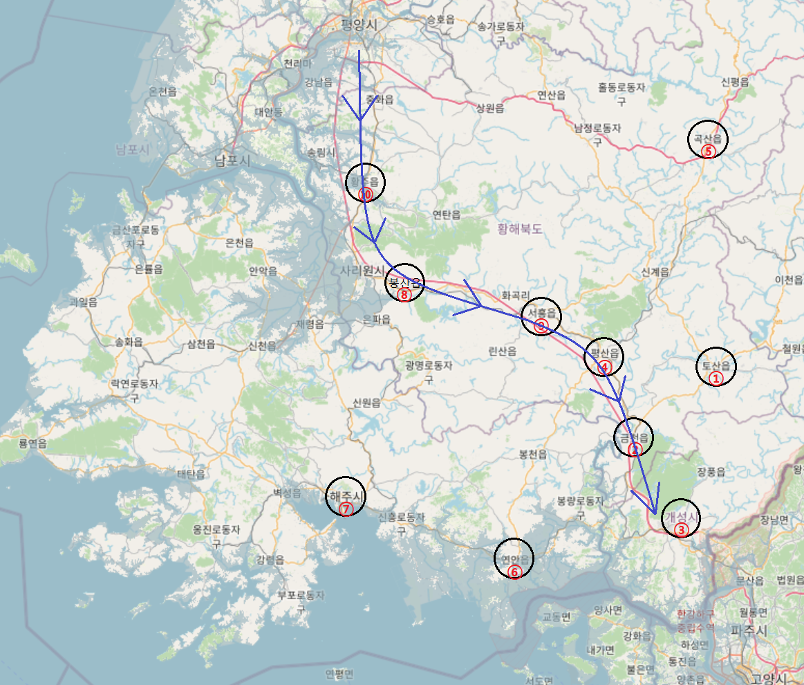 그럼 평양에서 개성까지 개척한 순서는 아래 지도와 같습니다. ( ↓ 표시)