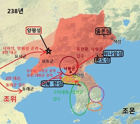 선우사와 유흔에게 각기 군사를 나눠 낙랑군, 대방군을 바다 건너 공격케 한다.